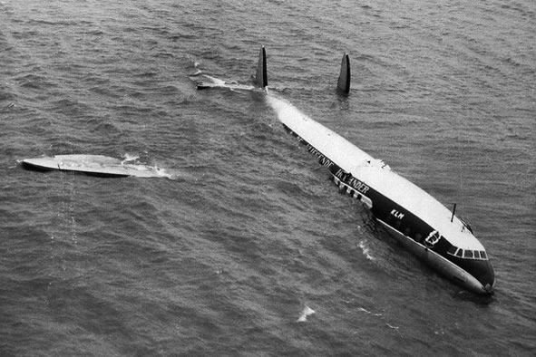 This KLM Super Constellation crashed into the Shannon River near Foynes shortly after takeoff. Twenty-eight out of 56 people were killed. Pilot error was to blame in that the captain did not interpret his instrument indications properly during flap retraction after the gear was re-extended.. |
