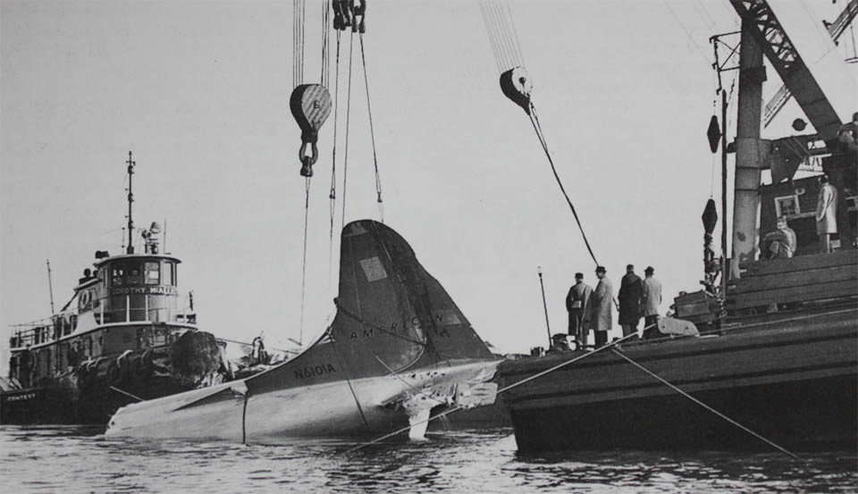 The wreckage of an American Airlines Lockheed L-188 Electra is pulled from the East River in New York. Failure of the crew to monitor their essential instruments was listed as the primary cause. |