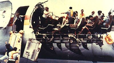 | An Aloha Airlines Boeing 737 landed safely after fatigue cracking caused the top portion of the fuselage to peel away. Everyone survived except for a flight attendant who was sucked out of the plane and lost at sea. |