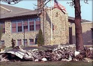 | The wreckage of Pennsylvania Senator John Heinz's plane which crashed in a school yard killing him along with 4 others. Also killed were 2 children playing in the schoolyard. The plane crashed after the blades of a helicopter performing an in-air inspection of the landing gear struck the bottom of the plane. |