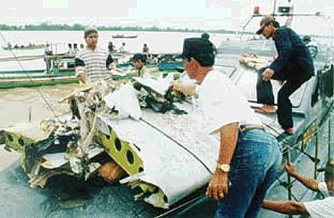 Pieces of wreckage from a SilkAir B737 that plunged to the ground from FL350. Suicide by the pilot or a rudder malfunction are some of the theories of the cause. |