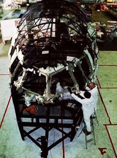 Reconstruction of the cockpit area of a Swissair MD-11 that crashed into the Atlantic Ocean after experiencing an uncontrollable fire aboard. |
