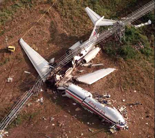 The wreckage of American Airlines Flight 1420 after it slid off the end of the runway while attempting to land in heavy rain and thunderstorms. The crew's decision to continue the approach despite severe thunderstorms in the area and crosswinds that exceeded American Airlines' guidelines led to the accident. Also, the crew did not arm the automatic spoiler system before landing or manually deploy the spoilers after touchdown. |