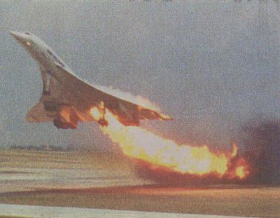 An Air France Concorde took off from Charles de Gaulle airport with port engines ablaze. Moments later, it crashed into a hotel-restaurant complex killing all 109 aboard along with 4 on the ground. A piece of debris on the runway caused a tire to burst and puncture a fuel tank. |