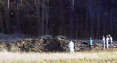 Wreckage of United Airlines Flight 93, a Boeing 757, on a scheduled flight from Newark to San Francisco, which crashed near Shanksville, Pennsylvania.