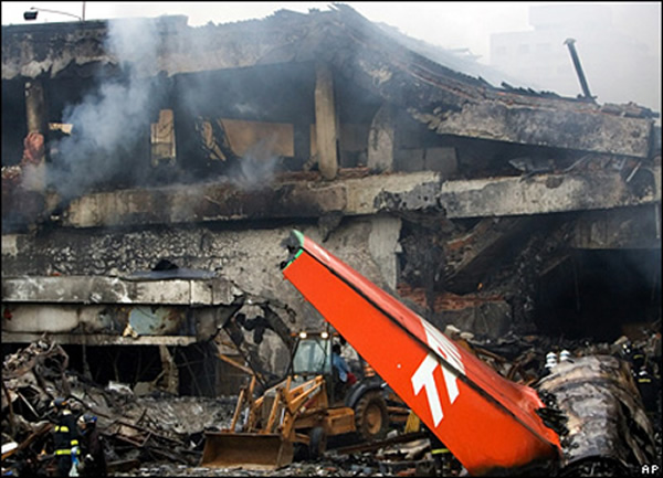 Fiery wreckage of a TAM Airbus after it attempted to land in heavy rain at Congonhas Airport. The plane skidded off the end of the runway across a major roadway and struck a gas station and building, bursting into flames. |