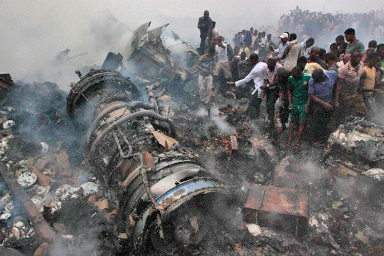 The plane was about 11 miles from Lagos VOR when the crew declared an emergency reporting engine problems. The plane collided with a power line and crashed into the Iju/Ishaga area of Lagos, 1 mile adjacent to the runway. |